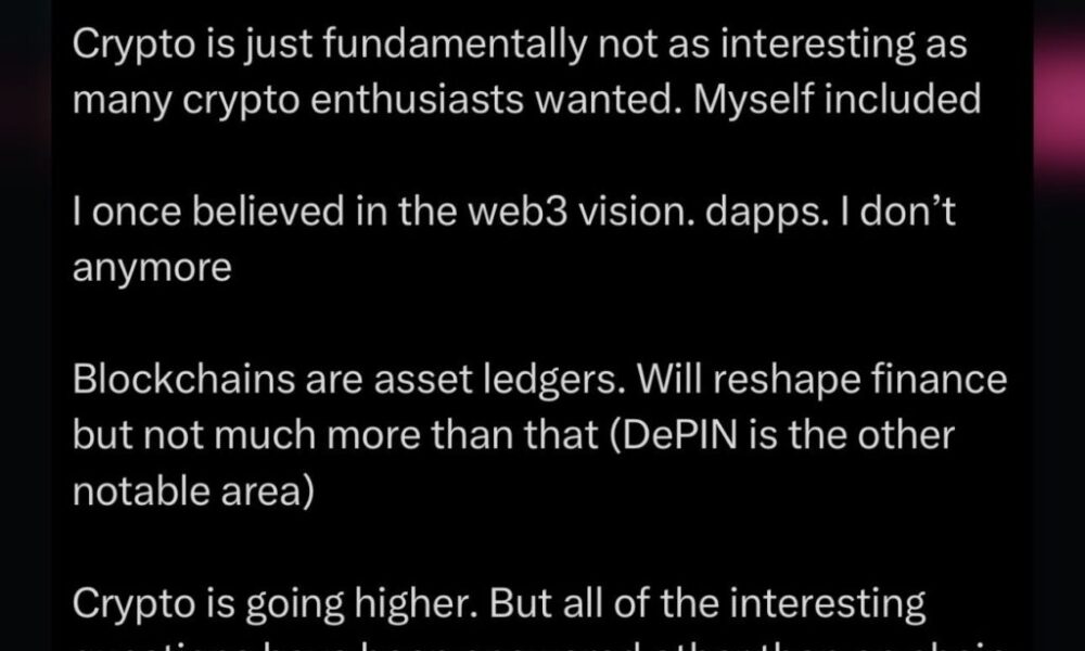 Samani, sildiği paylaşımında “Kripto esasen kriptoya meraklı birçok insanın istediği kadar ilgi çekici değil. Buna ben de dahilim. Bir zamanlar Web3 vizyonuna, merkeziyetsiz uygulamalara inanıyordum. Artık inanmıyorum. Blok zincirleri temelde varlık kayıt defterleridir. Finans dünyasını yeniden şekillendirecekler ancak bunun ötesinde çok fazla rol üstleneceklerini düşünmüyorum (DePIN de öne çıkan bir başka alan).” ifadelerini kullandı.
